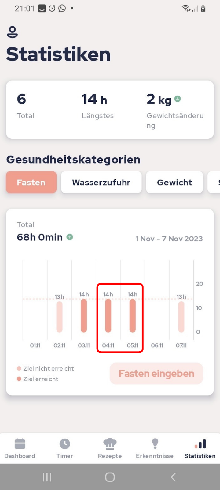 Um Ihr Tagesziel auf der Registerkarte 'Statistik' zu erreichen, müssen Sie an einem Tag so lange fasten. Sie können Ihren aktuellen Fastenverlauf auch jederzeit in Ihrem Profil überprüfen.