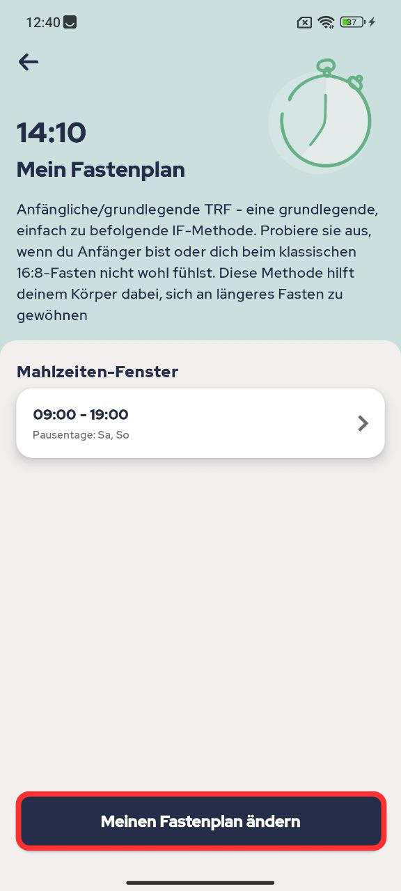 Ich kann mein Essensfenster nicht ändern. Wie kann ich das tun?