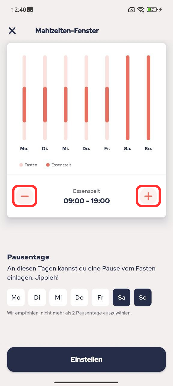 Danach können Sie Ihr Essensfenster mit den Schaltflächen + und - ändern. Sie können auch Ihre Fastentage festlegen, indem Sie sie anklicken: